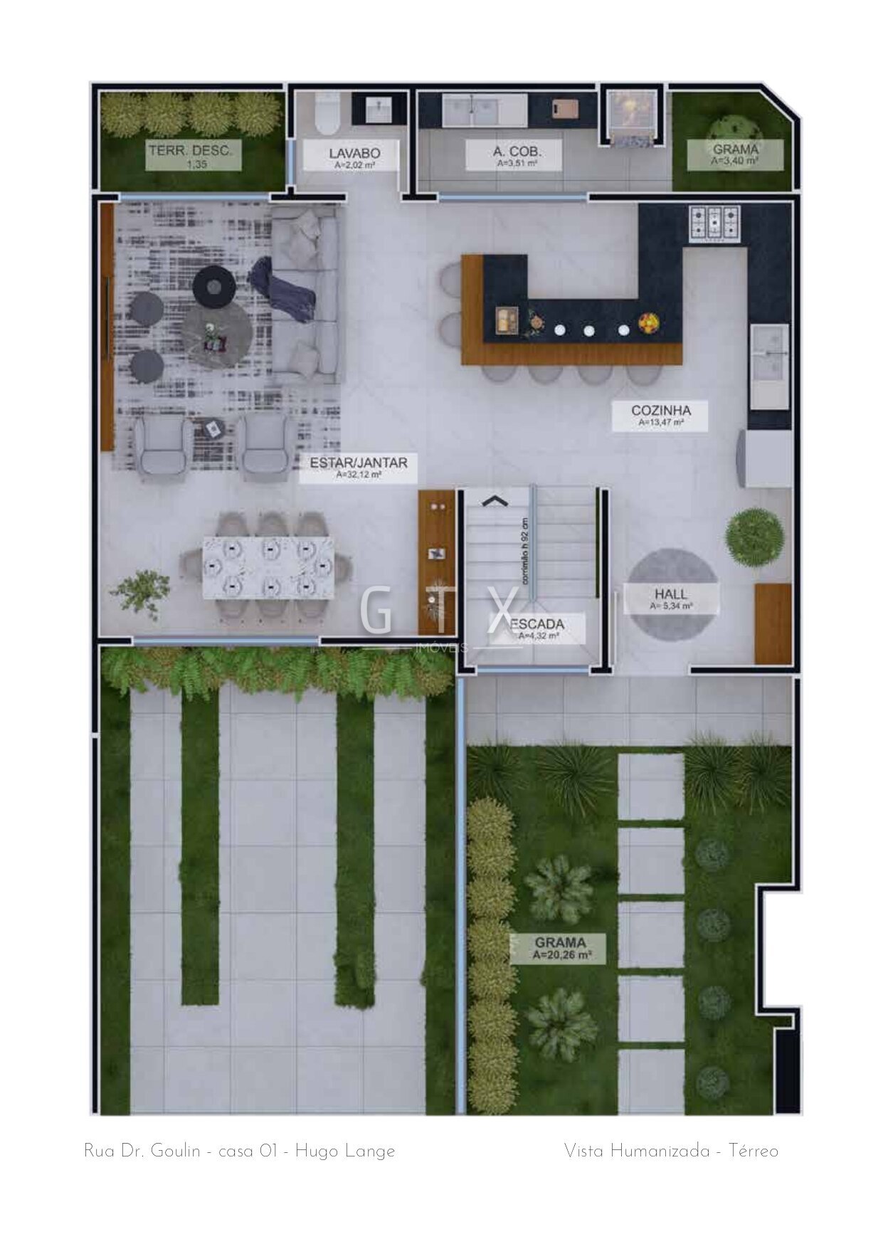 Cozinha integrada à ampla sala de estar e jantar, lavanderia e lavabo, além do espaço de jardim e quintal.