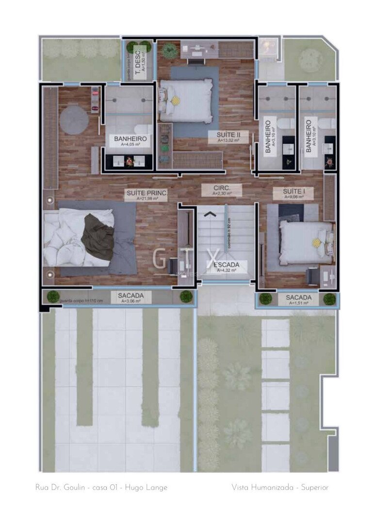 3 dormitórios, sendo 3 suítes, a principal com 2 cubas, closet e sacada, automação para persianas de todos os dormitórios.